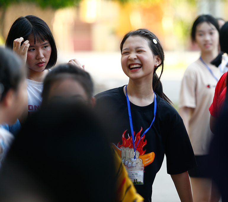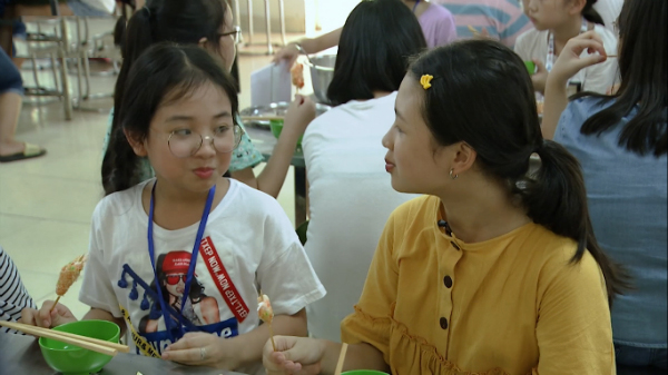 Ngọc Ánh và Hà Anh vui vẻ vừa ăn vừa đùa nghịch trong bữa trưa đầu tiên tại địa điểm huấn luyện.