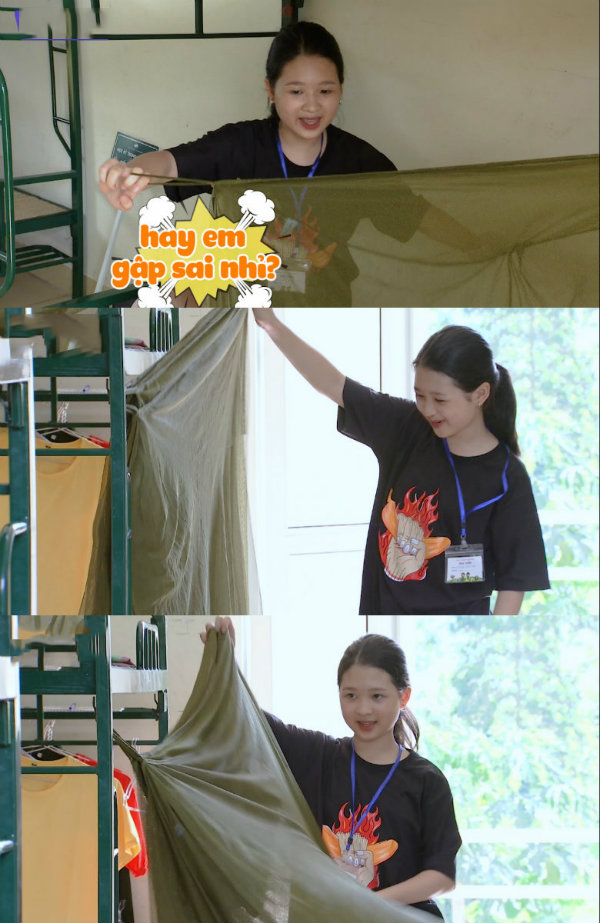 Bài học gấp chăn vuông “bất hủ” cũng làm khó chiến sĩ nhí không kém. Nhật Minh và Ngọc Ánh là hai anh chị lớn nhưng cũng không dễ dàng vượt qua thử thách này, trong khi Hữu Nhật chỉ biết loay hoay mà không gấp nổi màn, được biết ở nhà nam vương nhí cũng không bao giờ phải gấp chăn màn nên chắc hẳn nhiệm vụ này là quá khó với bé.