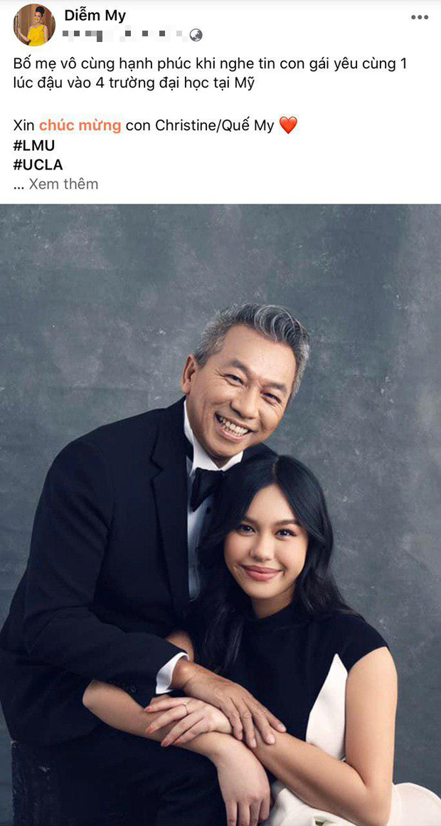 Theo đó nữ nghệ sĩ cho biết, sau 2 năm theo học tại một trường công lập ở bang California (Mỹ) thì con gái út Quế My của cô đã đậu một lúc 4 trường đại học danh giá tại Mỹ. Bên cạnh đó con gái lớn Thuỳ My cũng vừa tốt nghiệp đại học với thành tích xuất sắc.