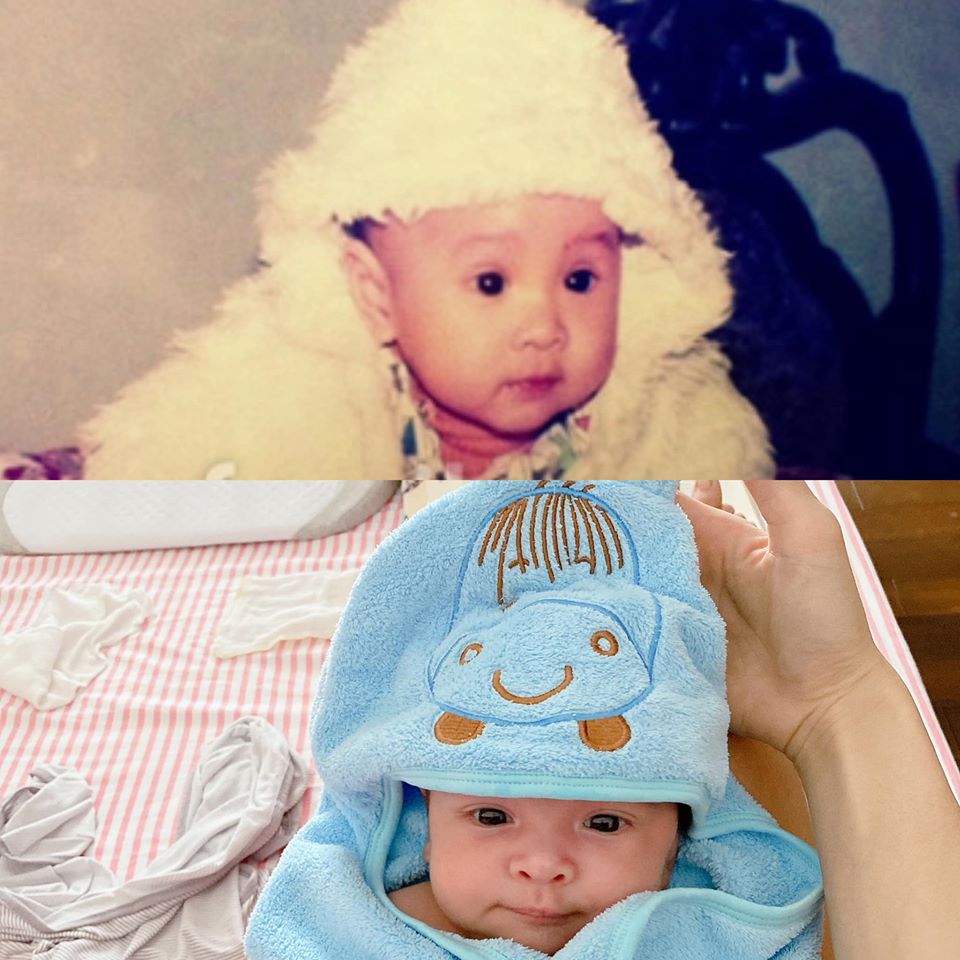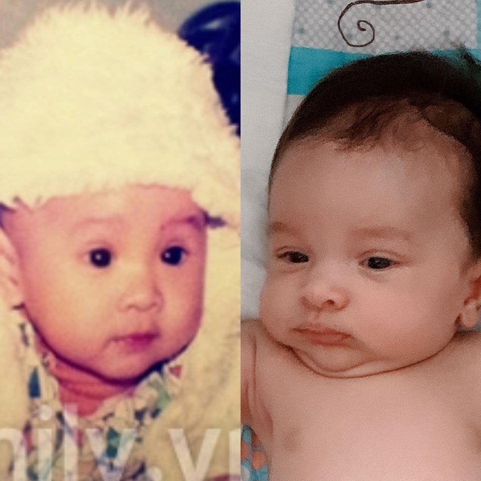 Mới đây trên trang cá nhân của mình, siêu mẫu Phương Mai đã khiến nhiều người thích thú khi đăng tải hình ảnh hồi nhỏ của cô bên cạnh ảnh con trai mới sinh cùng dòng chú thích liệt kê và chứng mình mọi đặc điểm trên gương mặt con trai đều giống mình. Cụ thể cô viết: