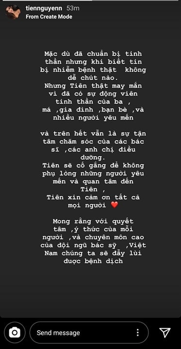 Về phía Tiên Nguyễn, sau 4 ngày được điều trị cách ly do dương tính với COVID-19, cô cũng đã có những chia sẻ đầu tiên trên trang cá nhân của mình.