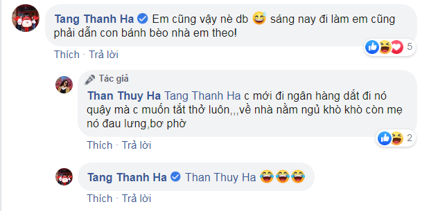 Sau khi dòng trạng thái của Thân Thúy Hà đăng tải, Tăng Thanh Hà đã ngay lập tức vào chia sẻ nỗi lòng với bà mẹ bỉm sữa. Nàng ngọc nữ cho biết: “Em cũng vậy nè Đại Bàng. Sáng nay đi làm em cũng phải dẫn con bánh bèo nhà em theo!”.