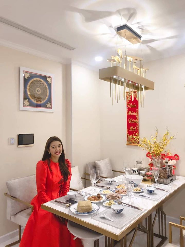 Trên chiếc bàn ăn của nàng Á hậu cũng đầy đủ các món ăn truyền thống ngày Tết như bánh chưng, chả cuốn,…