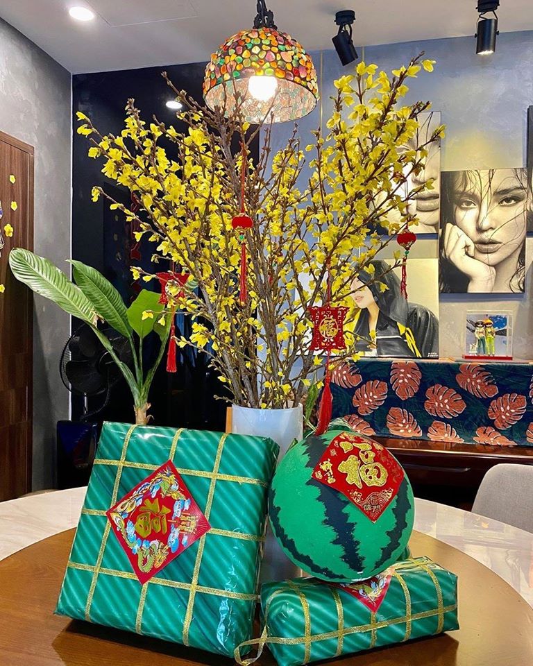 Không chỉ có hoa mai mà Hoa hậu Kỳ Duyên còn trang trí phòng của mình với bánh chưng bánh tét và dưa hấu
