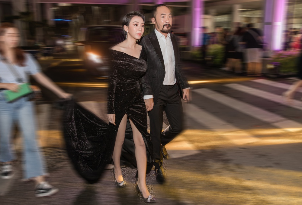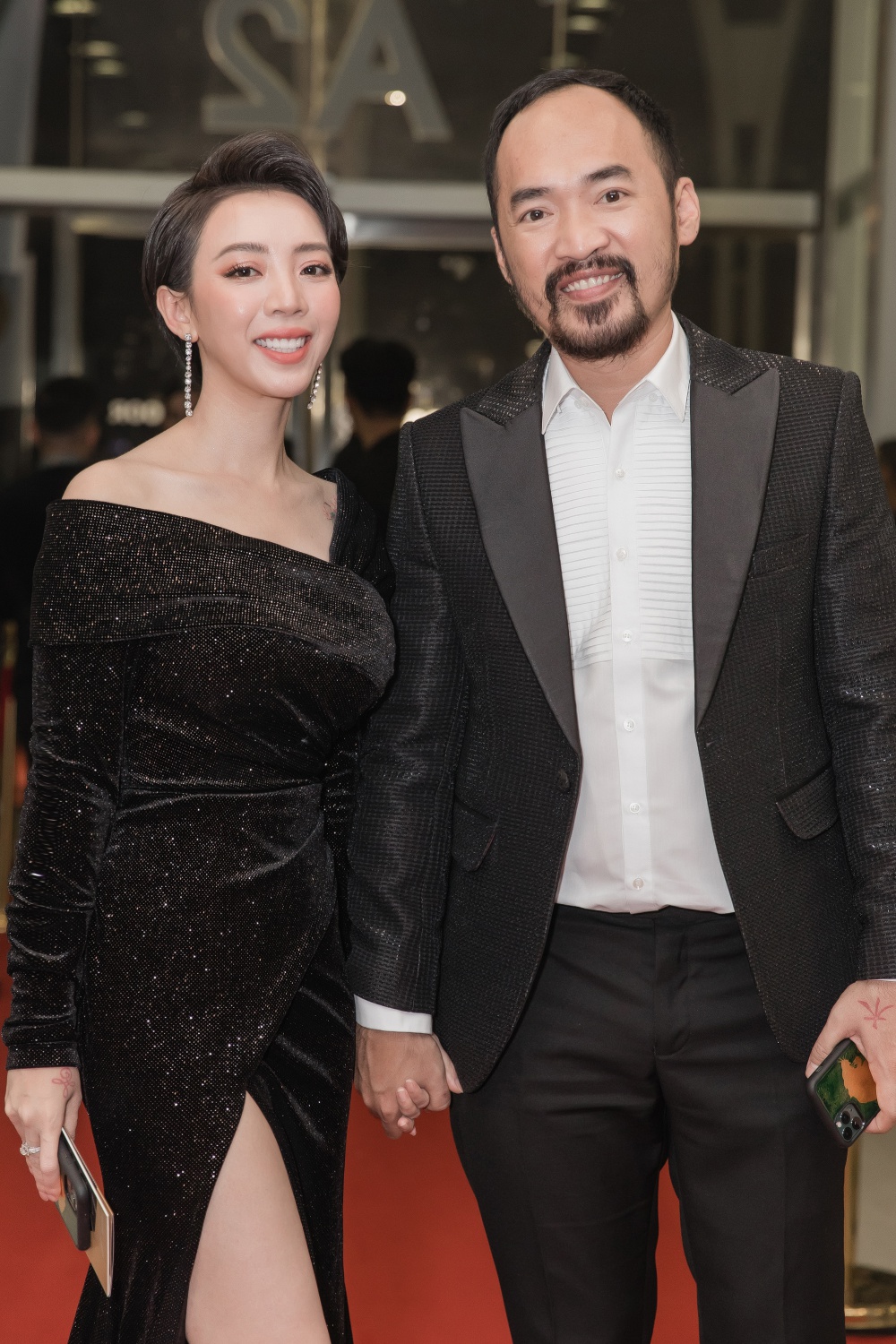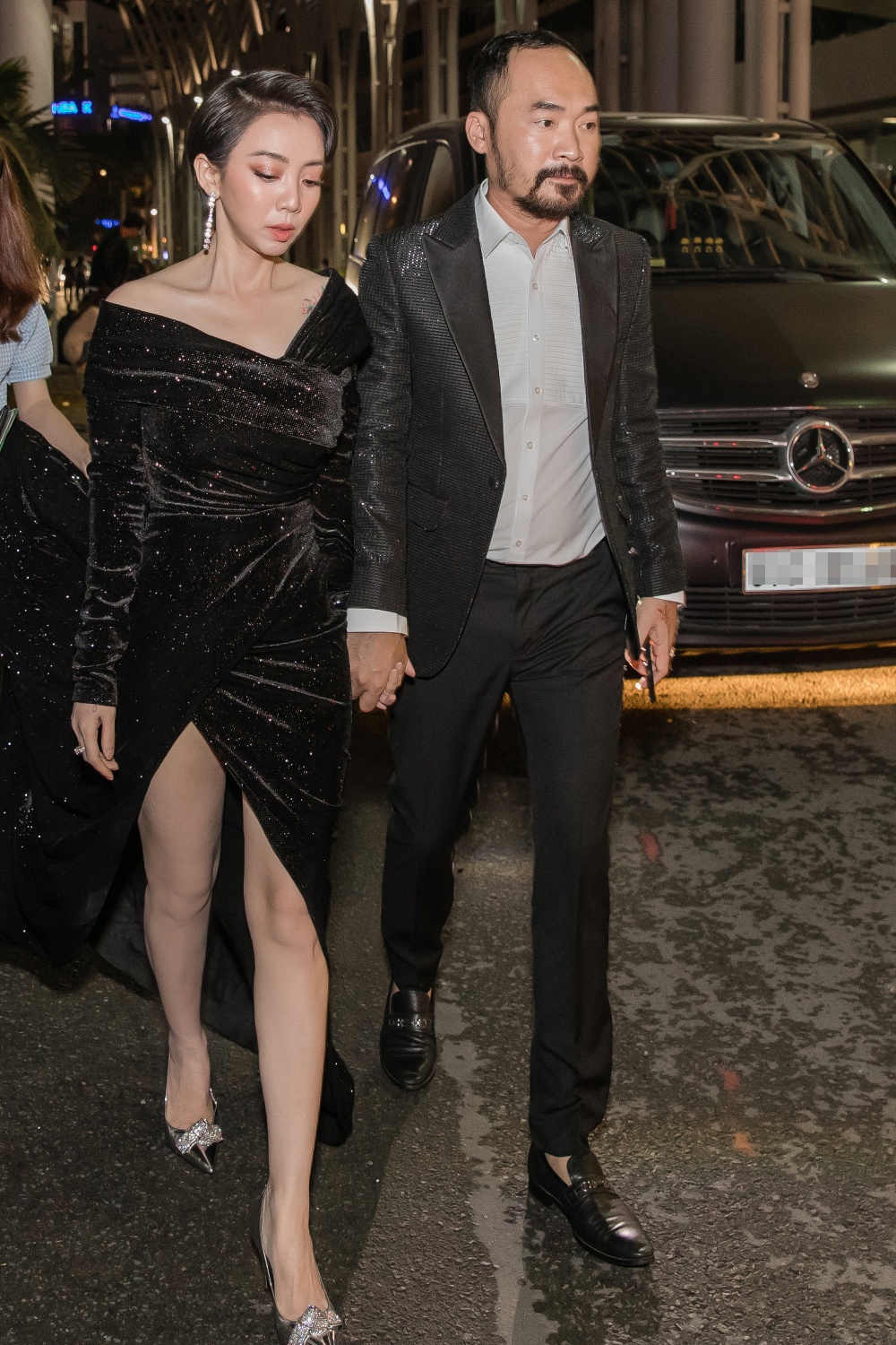 Sánh đôi cùng Thu Trang ở thảm đỏ là Tiến Luật. Theo tiết lộ từ Thu Trang, Tiến Luật vừa quay phim xong đã vội vã chạy về TP.HCM để hộ tống vợ đi sự kiện. Suốt thời gian góp mặt tại chương trình, Thu Trang - Tiến Luật liên tục nắm tay nhau tình tứ.