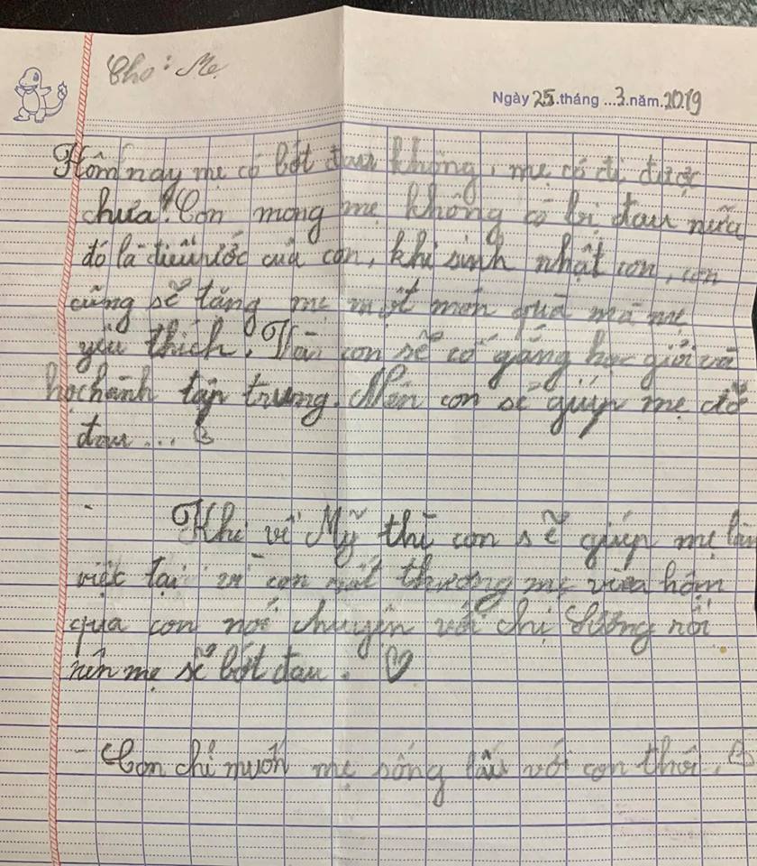 'Hôm nay mẹ có bớt đau không, mẹ có đi được chưa? Con mong mẹ không có bị đau nữa, đó là điều ước của con. Khi sinh nhật con, con sẽ tặng mẹ một món quà mà mẹ yêu thích. Và con sẽ cố gắng học giỏi và học hành tập trung. Nên con sẽ giúp mẹ đỡ đau. Khi về Mỹ thì con sẽ giúp mẹ làm việc tại vì con rất thương mẹ. Vừa hôm qua con nói chuyện với chị Sương rồi nên mẹ sẽ bớt đau. Con chỉ muốn mẹ sống lâu với con thôi'.