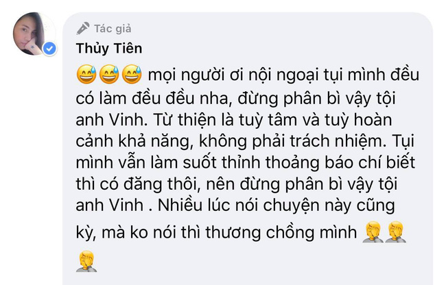 “Mọi người ơi, nội ngoại tụi mình đều có làm nha, đừng phân bì vậy tội anh Vinh. Từ thiện là tùy tâm và tùy hoàn cảnh khả năng, không phải trách nhiệm. Tụi mình vẫn làm từ thiện suốt, thỉnh thoảng báo chí biết thì đưa tin thôi, đừng phân bì vậy tội anh Vinh. Nhiều lúc nói chuyện này cũng kỳ, mà không nói thì thương chồng mình”.