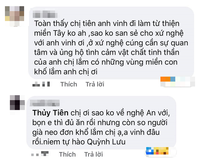 Tuy nhiên việc Thủy Tiên liên tục làm từ thiện ở miền Tây đã khiến nhiều một bộ phận khán giả không khỏi thắc mắc vì sao vợ chồng cô không về Nghệ An - quê của Công Vinh để làm từ thiện, trong khi ở đây cũng có những nơi bà con rất khó khăn.
