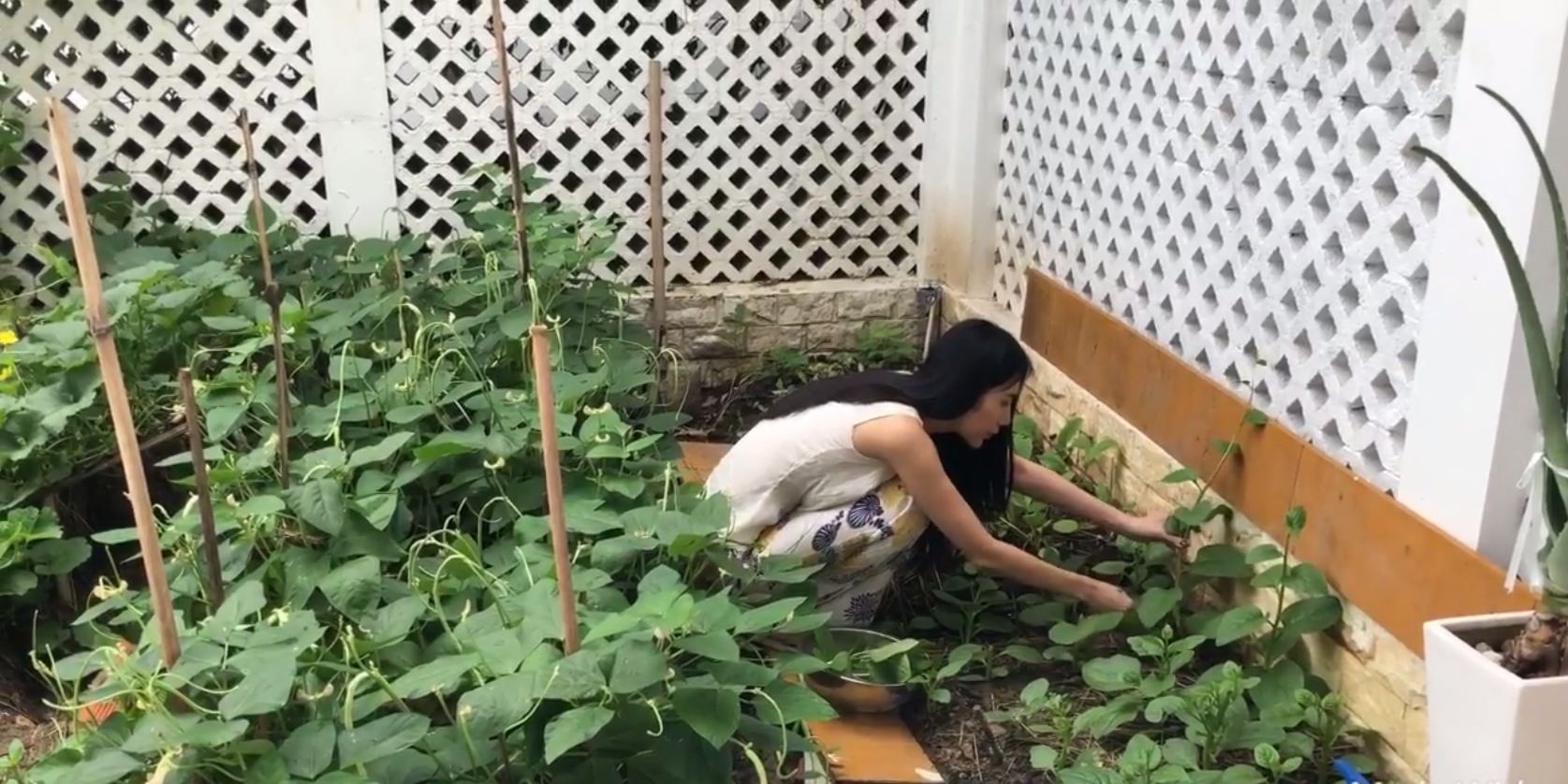 Clip: Thủy Tiên vui vẻ thu hoạch rau trong khu vườn sau nhà.