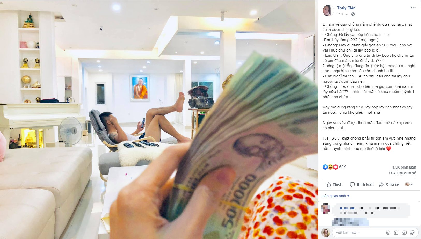 - Chồng: Nay đi đánh giải golf ăn 100 triệu, cho vợ vài chục chứ chi, đi lấy bóp lẹ đi.