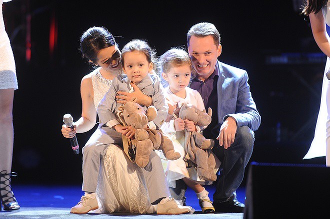 Gia đình diva Hồng Nhung chụp chung ảnh trên sâu khấu biểu diễn của cô.