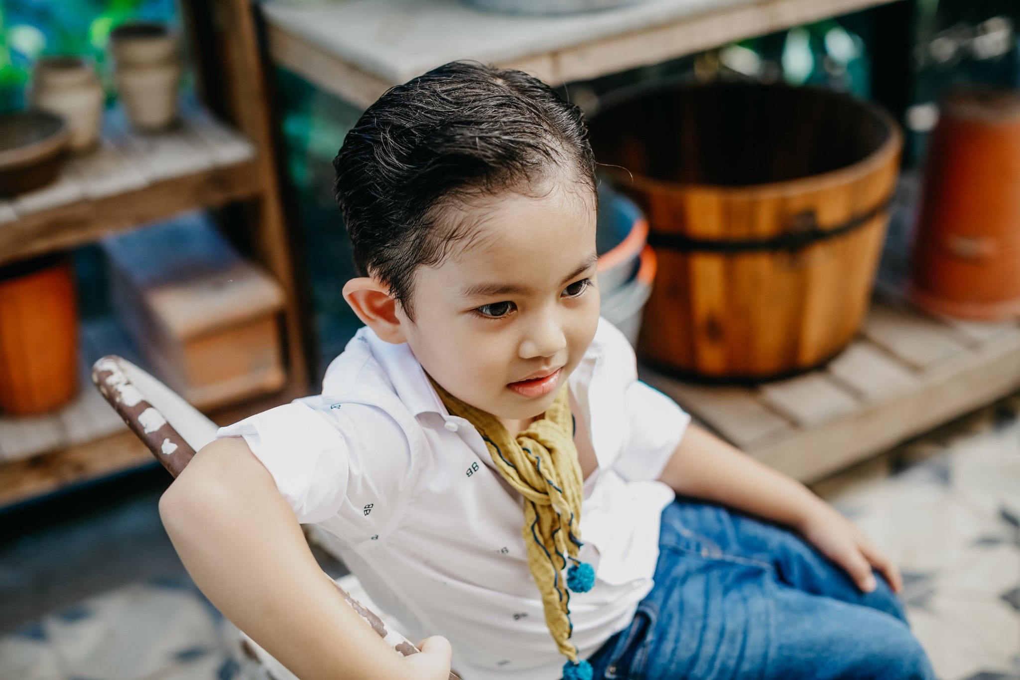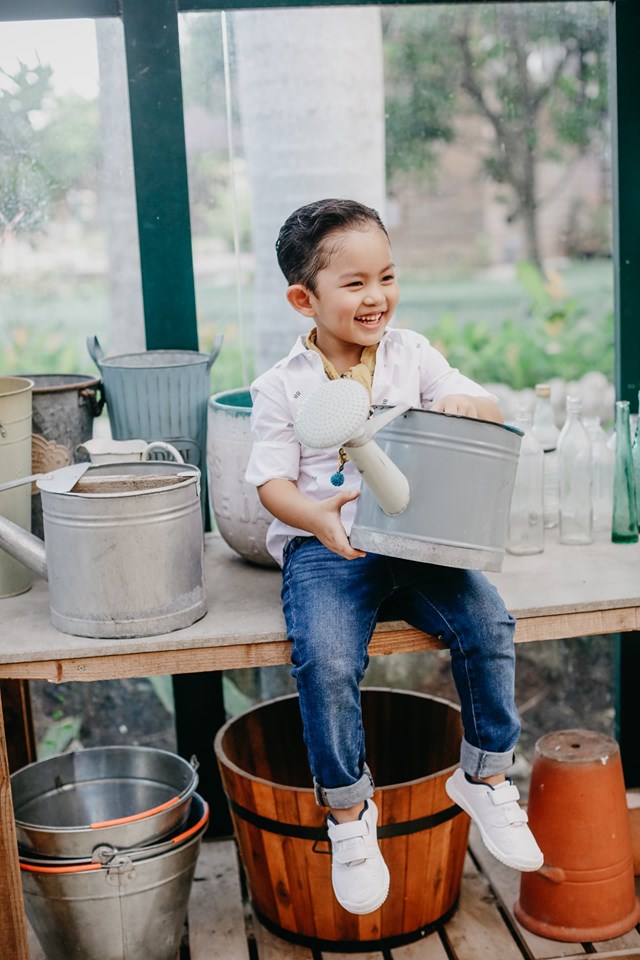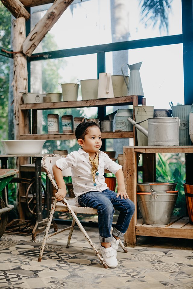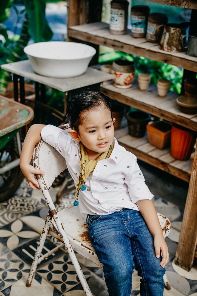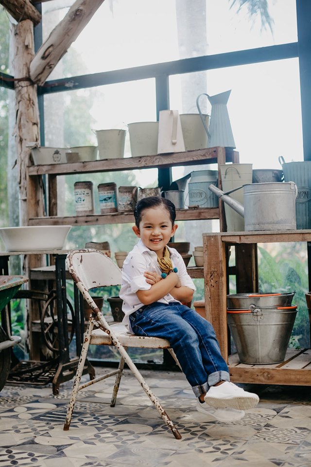Cậu nhóc 4 tuổi sỡ hữu nhiều nét đẹp được thừa hưởng từ bố và mẹ. Được mẹ diện trang phục quần jeans và sơ mi trắng, trông cậu nhóc thật sự bảnh bao. Không những thế, có vẻ ống kính chuyên nghiệp không hề làm khó cậu nhóc.