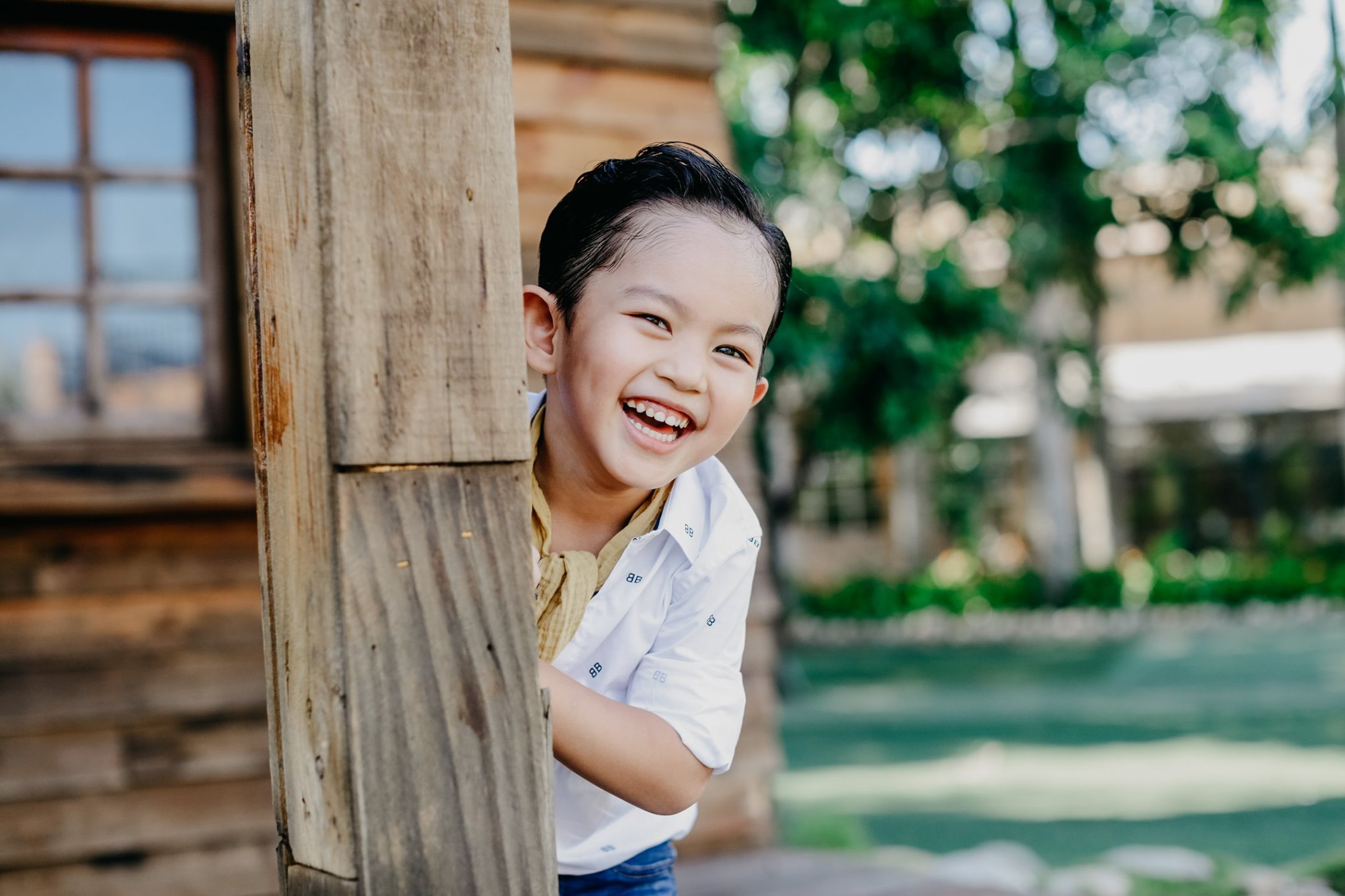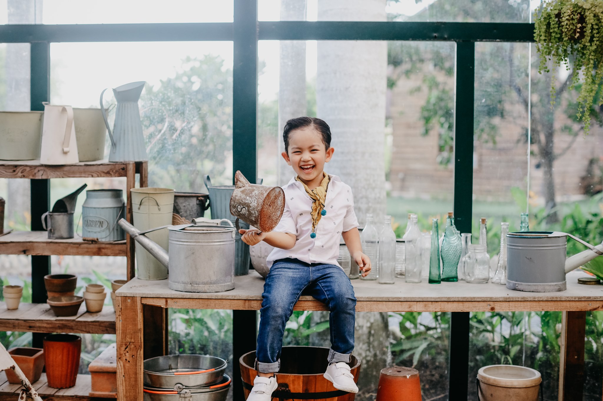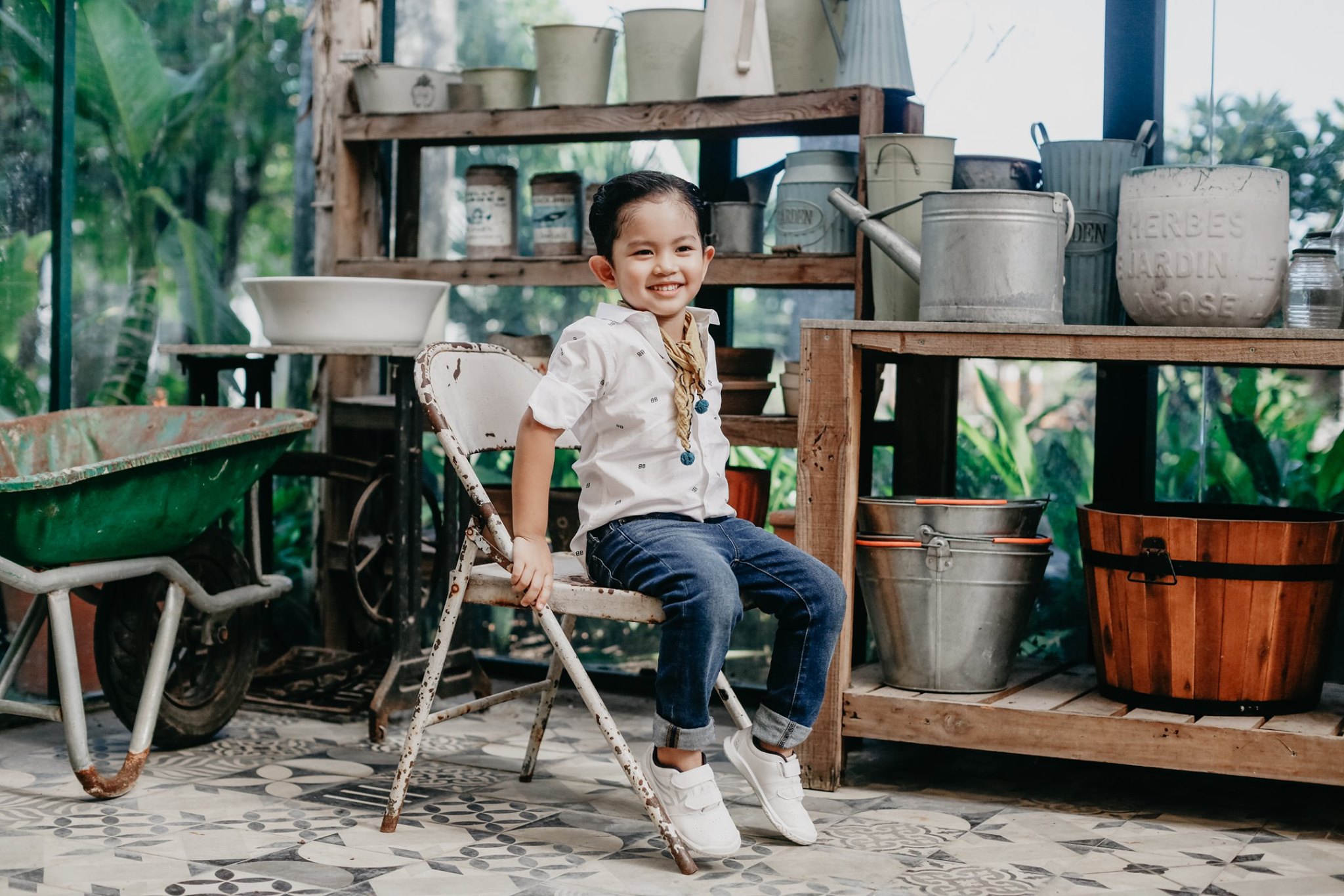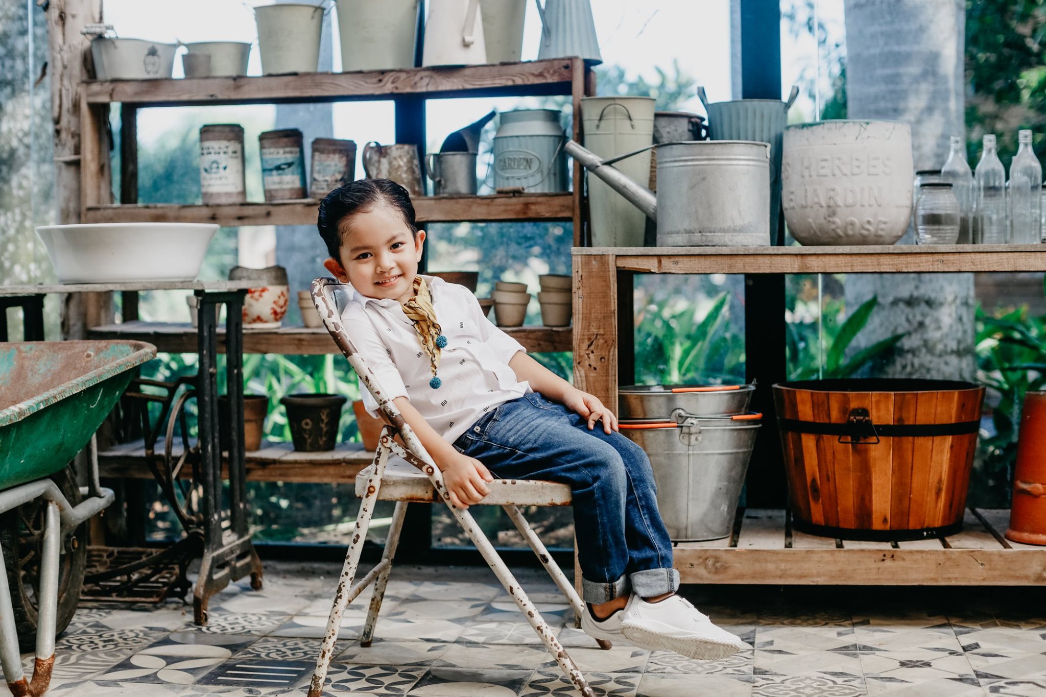 Cậu nhóc 4 tuổi sỡ hữu nhiều nét đẹp được thừa hưởng từ bố và mẹ. Được mẹ diện trang phục quần jeans và sơ mi trắng, trông cậu nhóc thật sự bảnh bao. Không những thế, có vẻ ống kính chuyên nghiệp không hề làm khó cậu nhóc.