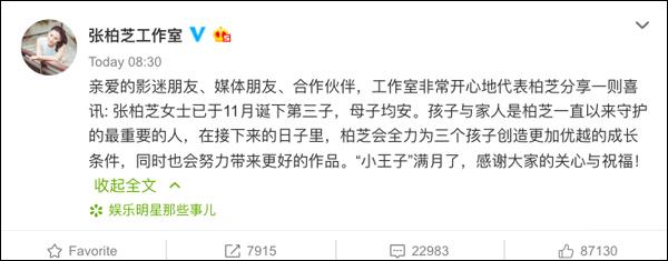 Trên Weibo chính thức của quản lý Trương Bá Chi, cô đưa ra thông báo: “Gửi các bạn fan thân mến, gửi báo chí truyền thông và tất cả bạn bè. Studio chúng tôi vui mừng khi trở thành người đại diện cho Trương Bá Chi thông báo tin vui với tất cả mọi người: Tháng 11 vừa rồi, Trương Bá Chi đã sinh con thứ 3 và mẹ tròn con vuông. Con trai và người thân luôn là những người mà Bá Chi muốn bảo vệ.”