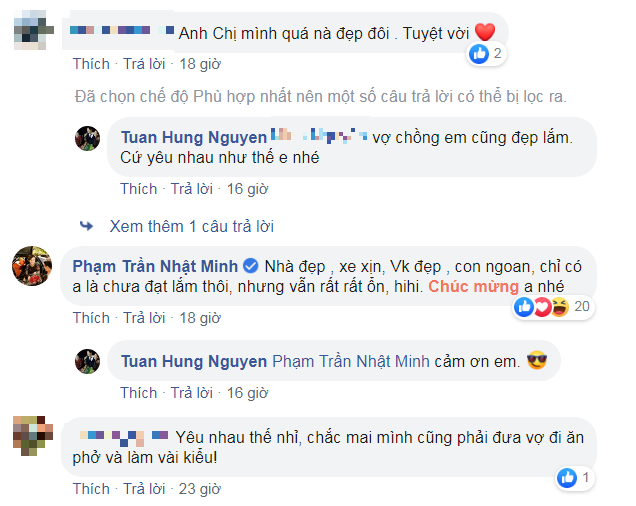 Thậm chí “Đại gia siêu xe” khét tiếng Sài Gòn - Minh Nhựa (Phạm Trần Nhật Minh) còn để lại bình luận thể hiện sự ngưỡng mộ với Tuấn Hưng, anh viết: “Nhà đẹp, xe xịn, vợ đẹp, con ngoan, chỉ có anh là chưa đạt lắm thôi, nhưng vẫn rất rất ổn, hihi. Chúc mừng anh nhé”.