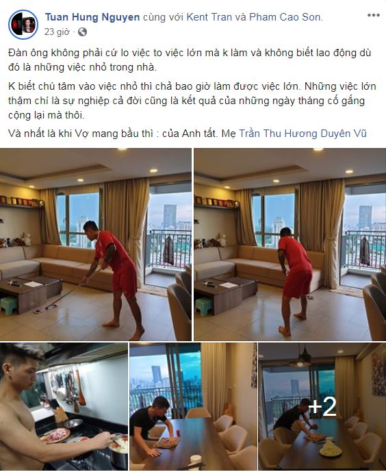 Hình ảnh nam ca sĩ cặm cụi lau nhà phụ giúp vợ đang bầu bì được chính anh 'khoe' trên trang cá nhân, theo đó Tuấn Hưng cho rằng: “Không biết chú tâm vào việc nhỏ thì chả bao giờ làm được việc lớn”
