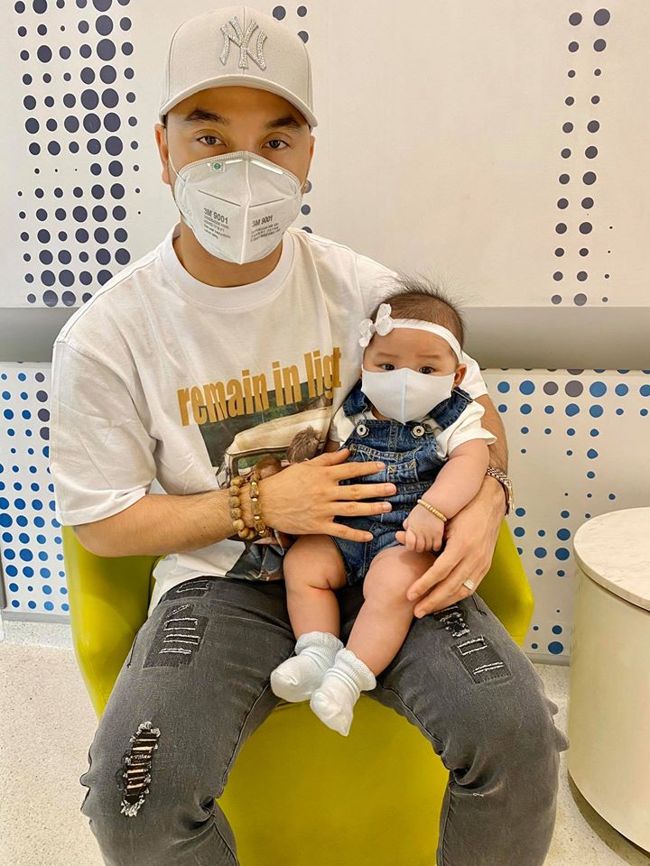 Trước đó Ưng Hoàng Phúc cũng đã chia sẻ hình ảnh anh cùng con gái đeo khẩu trang kín mít khi đưa cô bé đi tiêm ngừa
