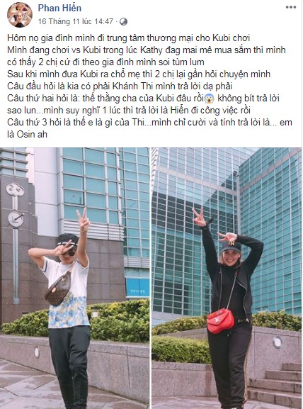 “Hôm nọ gia đình mình đi trung tâm thương mại cho Kubi chơi. Mình đang chơi với Kubi trong lúc Khánh Thi đang mải mê mua sắm thì mình có thấy 2 chị cứ đi theo gia đình mình soi tùm lum. Sau khi mình đưa Kubi ra chỗ mẹ thì 2 chị lại gần hỏi chuyện mình.
