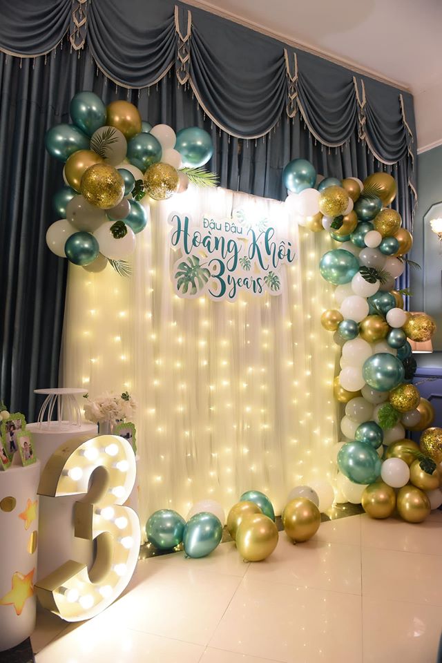 Buổi tiệc diễn ra ở không gian sang trọng, được trang hoàng hoàng với rất nhiều bóng bay tông trắng, xanh và vàng đồng