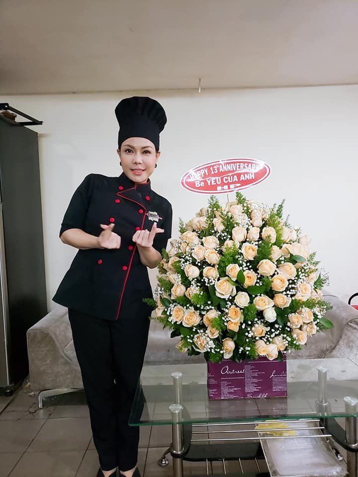 Mới đây nhất nữ nghệ sĩ đã khiến mọi người một phen bất ngờ khi chia sẻ hình ảnh cô đứng cạnh một lẵng hoa 'siêu to khổng lồ' do chính ông xã gửi tặng nhân dịp kỷ niệm 13 năm quen nhau của cả hai vợ chồng.