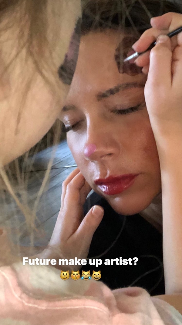 Mới đây, cặp vợ chồng đình đám Hollywood David và Victoria Beckham vừa hé lộ hình ảnh hậu trường một buổi trang điểm khiến cư dân mạng vô cùng phấn khích. Bởi lẽ người phụ trách công việc “họa mặt” không phải nghệ sĩ tiếng tăm nào mà chính là con gái cưng của cặp đôi: Harper Beckham. Ban đầu cô bé chỉ vẽ mặt mèo cho mẹ Vic thôi nhưng vì bố Becks về nhà đúng lúc nên được “rủ rê” tham gia.