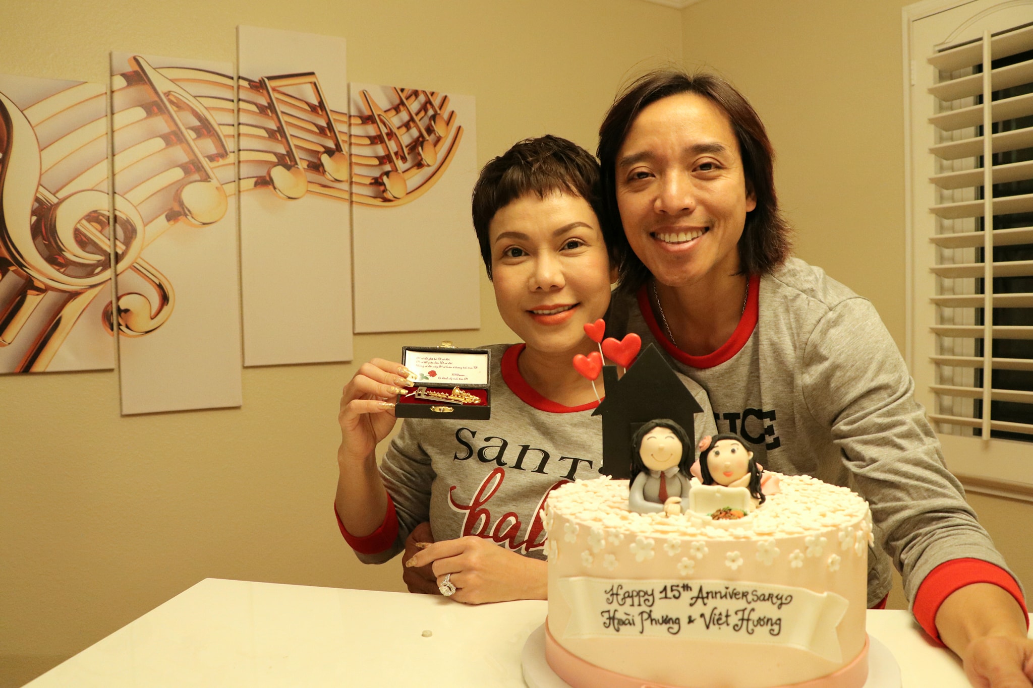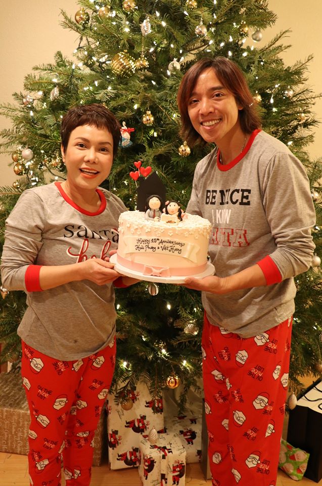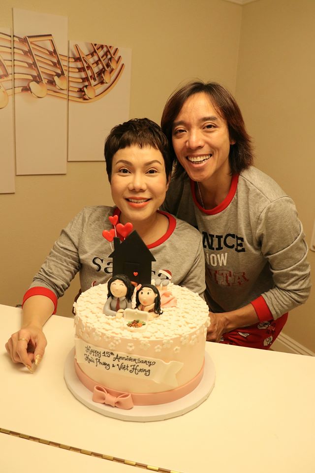 Vào ngày 24/12 vừa qua, trên trang cá nhân của nhạc sĩ Hoài Phương - ông xã nghệ sĩ hài Việt Hương đã thu hút sự chú ý của mọi người khi đăng tải loạt hình ảnh hai vợ chồng cùng diện đồ đôi và thơm má nhau đầy tình cảm bên chiếc bánh kem để kỷ niệm 15 năm ngày yêu nhau. Anh còn đính kèm dòng trạng thái mùi mẫn gửi tới bà xã của mình:
