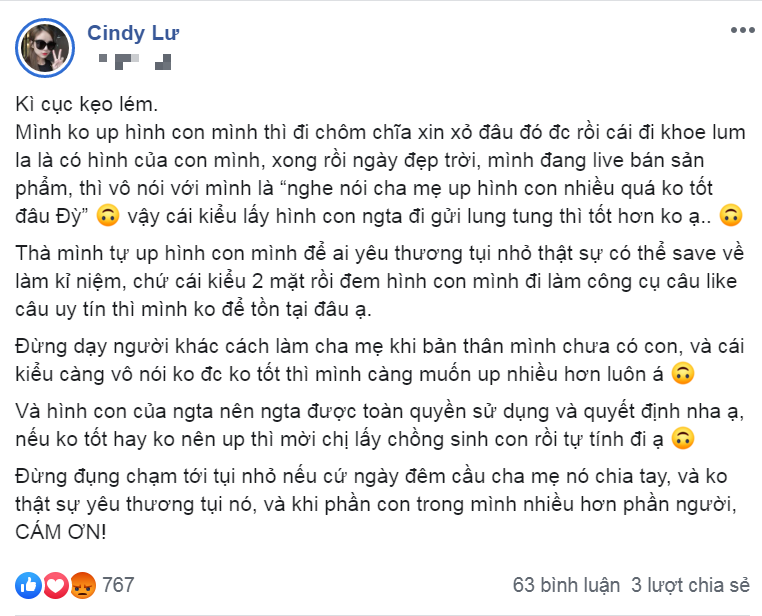 Cụ thể, bà xã Hoài Lâm viết: “Kì cục kẹo lém. Mình không up hình con mình thì đi chôm chỉa xin xỏ đâu đó được rồi cái đi khoe lum la là có hình của con mình, xong rồi ngày đẹp trời, mình đang live bán sản phẩm, thì vào nói với mình là 'nghe nói cha mẹ up hình con nhiều quá không tốt đâu Đỳ'. Vậy cái kiểu lấy hình con người ta đi gửi lung tung thì tốt hơn không ạ? Thà mình tự up hình con mình để ai yêu thương tụi nhỏ thật sự có thể lưu về làm kỉ niệm chứ cái kiểu 2 mặt rồi đem hình con mình đi làm công cụ câu like, câu uy tín thì mình không để tồn tại đâu ạ!