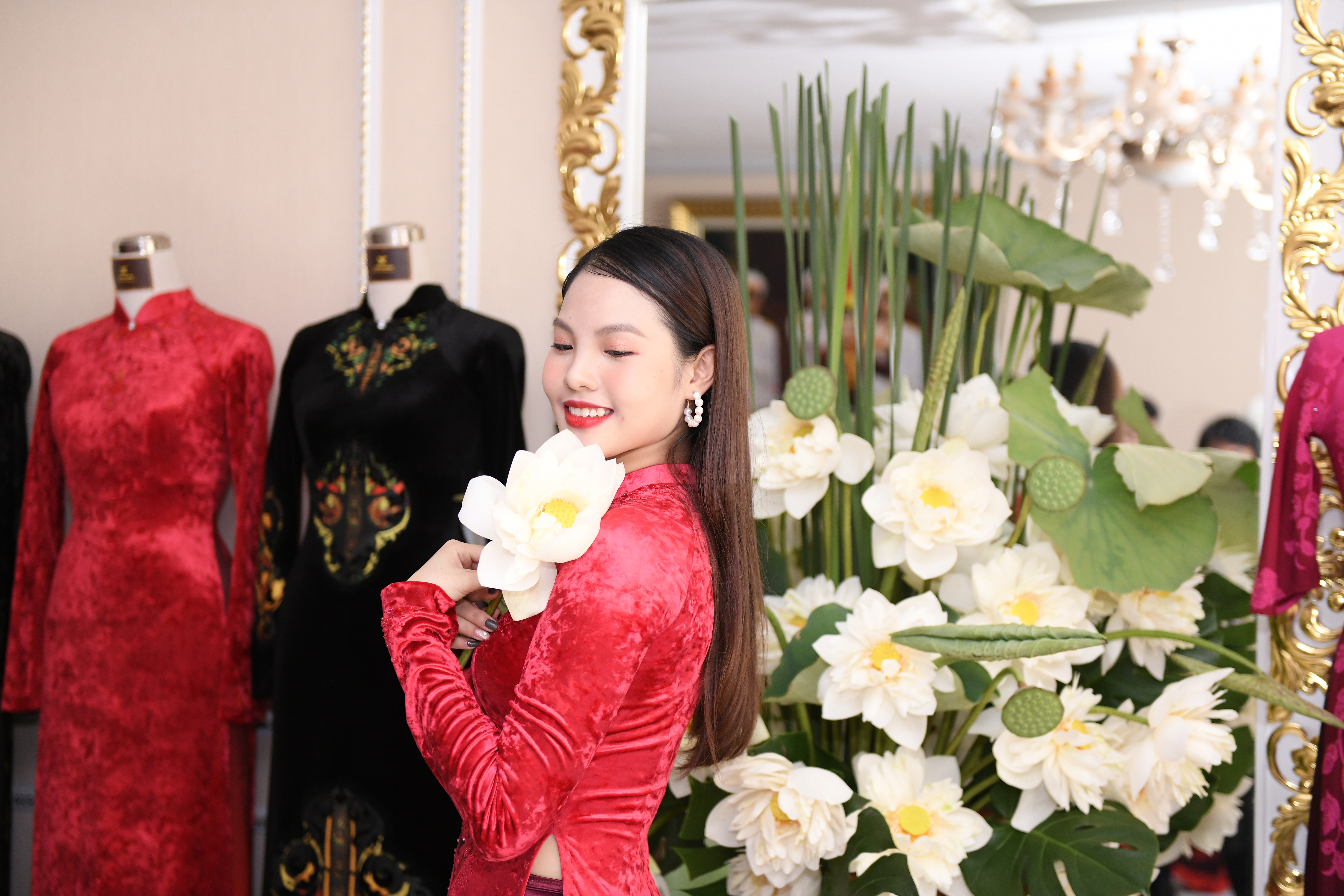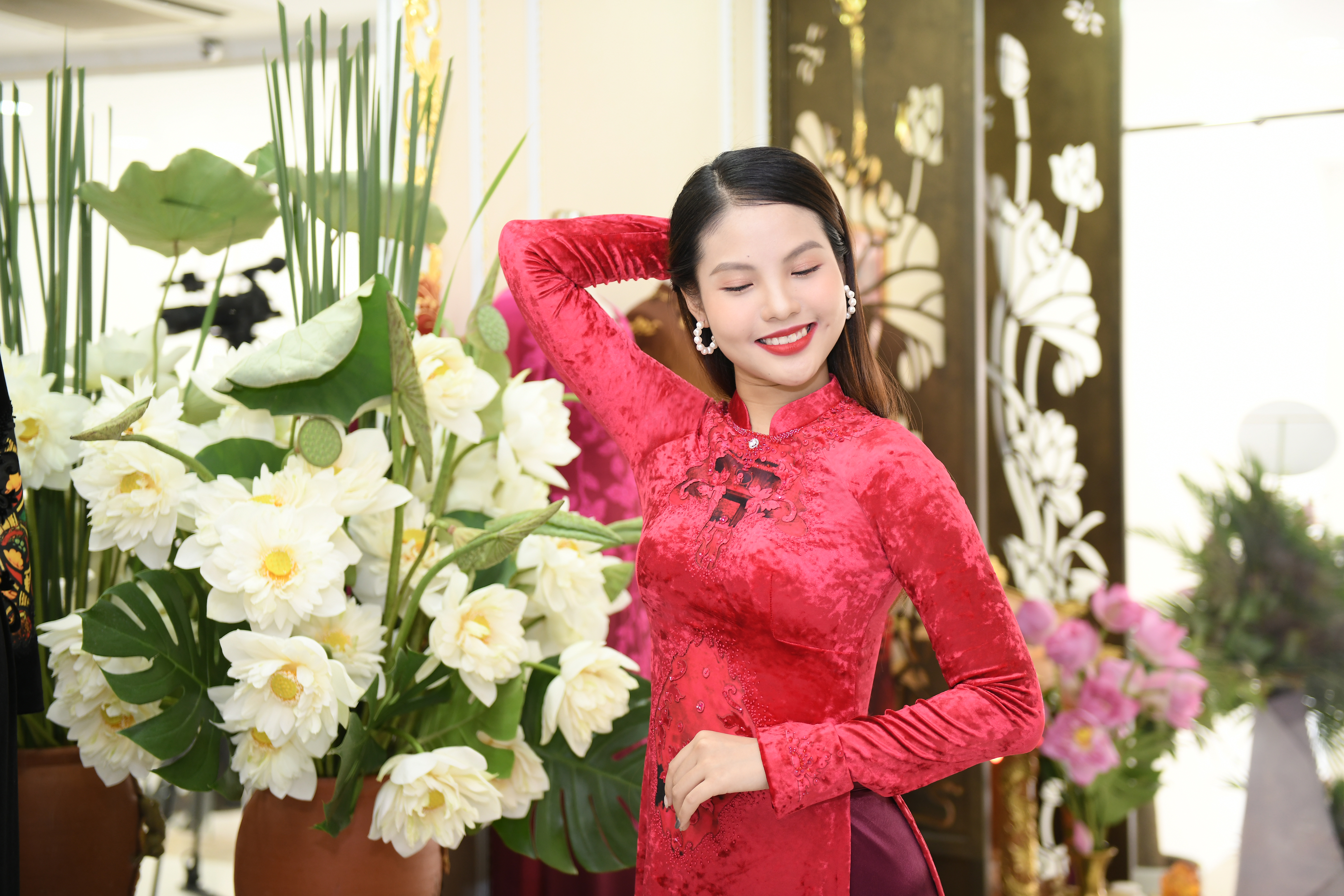 Thiết kế áo dài hoạ tiết hoa sen khiến Khánh Linh thêm nổi bật