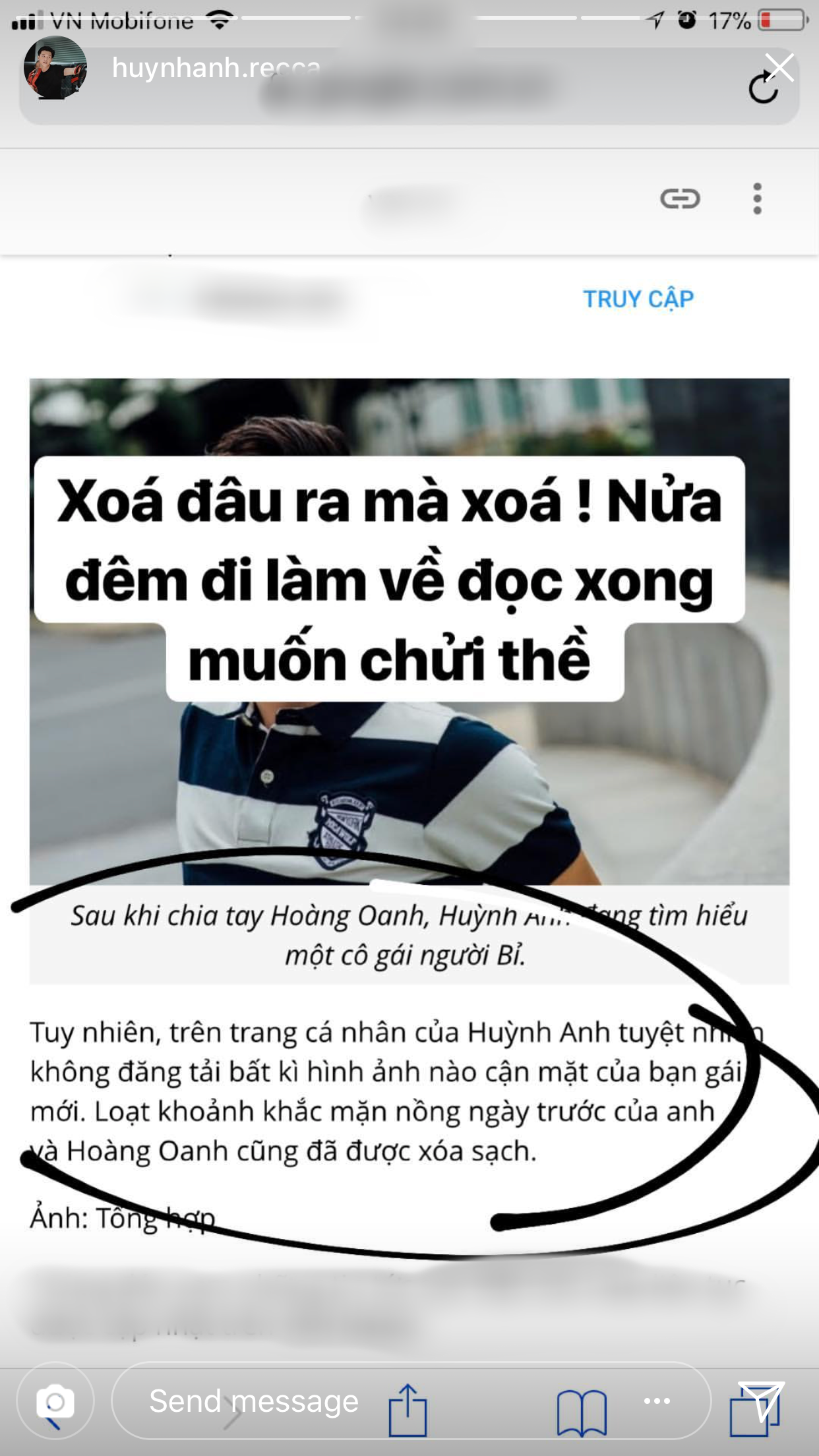 Mới đây, trên Instagram Story, Huỳnh Anh gây chú ý khi chia sẻ loạt bài viết liên quan đến anh và tình cũ Hoàng Oanh. Cụ thể, khi bị một trang mạng đưa tin sai lệch về mối quan hệ giữa cả hai hiện tại, nam diễn viên Tình khúc bạch dương tỏ ra khá bức xúc.