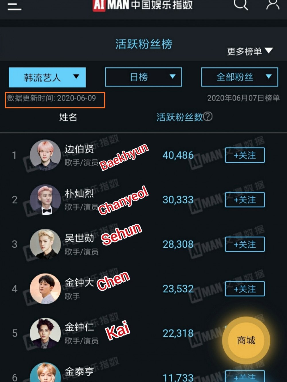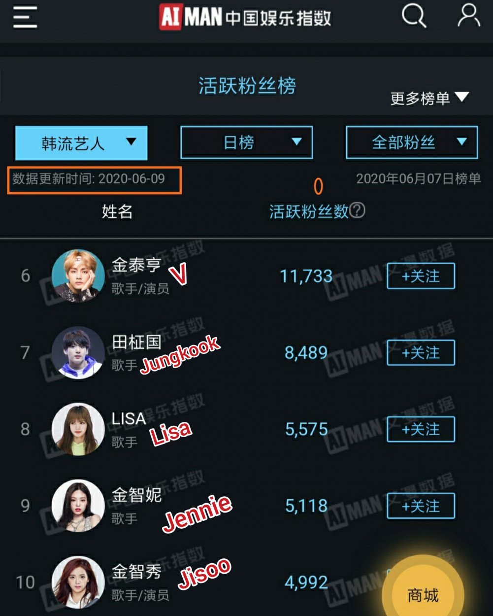 Mới đây, China AiMan Index đã công bố xếp hạng những ca sĩ thần tượng Hàn Quốc gây sức ảnh hưởng lớn, sở hữu lượng fan hùng hậu nhất tại thị trường Trung Quốc. Theo đó, kết quả cho thấy những ngôi sao có mặt trong top 10 đều là những nghệ sĩ hàng đầu không chỉ ở khu vực châu Á mà còn lan tỏa ra khắp thế giới. Hiện tại, các thành viên của nhóm nhạc EXO, BTS và BLACKPINK đang thống trị danh sách xếp hạng, với mức độ nổi tiếng đáng kinh ngạc.