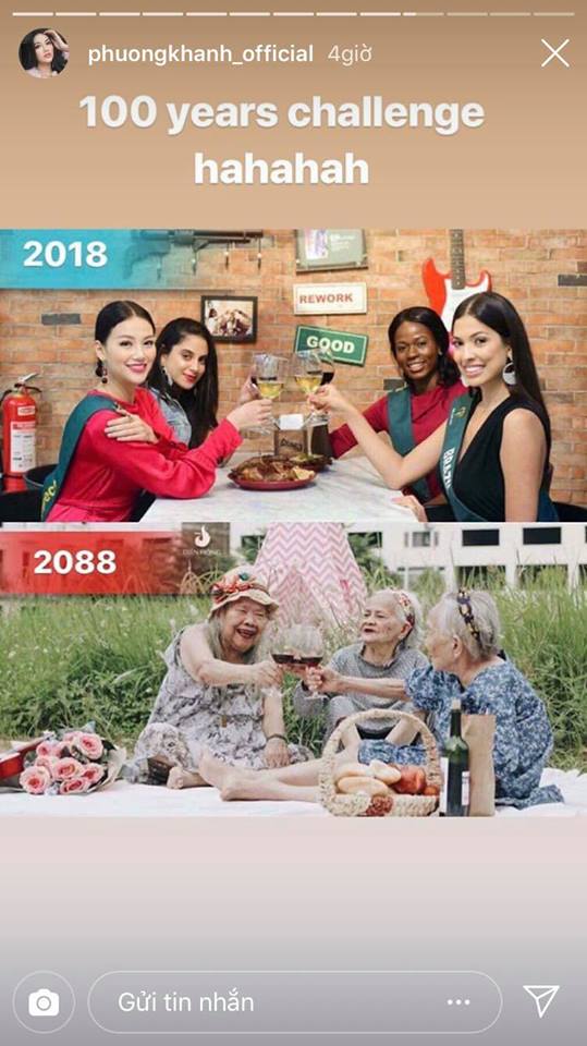 Tham gia vào trào lưu này, Phương Khánh là cô hoa hậu lầy lội nhất khi tiến thẳng đến tương lai của 100 năm sau chứ không quay về 10 năm trước. Cụ thể là nàng hậu đăng tải 1 tấm hình phía trên là ngồi cùng các cô hoa hậu khác khi tham gia cuộc thi Miss Earth và ở dưới là tấm hình ở năm 2088 khi ngồi cùng các bạn già. Người hâm mộ hình vào tấm hình cũng lăn ra cười lặc lè vì sự hài hước của Phương Khánh.