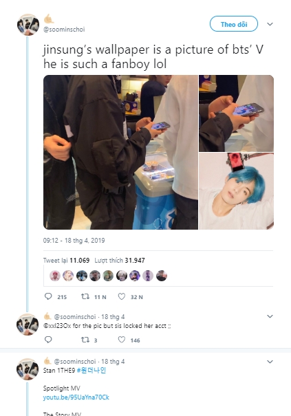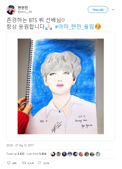 Hyun Min đã bày tỏ tình yêu của mình với V trên mạng xã hội, anh chàng đã đăng một bức chân dung tự vẽ của V lên tài khoản Twitter của mình kèm dòng tweet: “Tiền bối V BTS mà tôi ngưỡng mộ. Tôi luôn luôn cổ vũ cho bạn! #From_ARMY_Hyunmin”