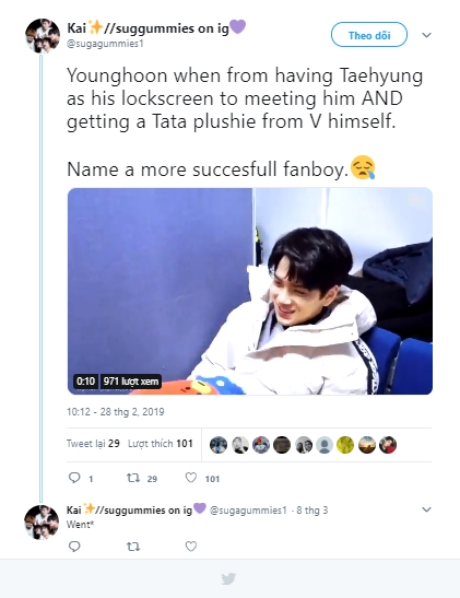 Cả hai đã trở nên thân thiết, với việc V tặng cho Young Hoon một chú gấu bông BT21 Tata! Younghoon tuyên bố rằng anh chàng mang theo chú gấu bông khắp mọi nơi với anh chàng kể từ khi tiền bối yêu thích của nam idol tặng nó cho mình!