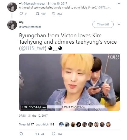 Byung Chan đã thể hiện tình yêu dành cho V trong một video mà anh chàng cho biếtđề cập rằng VICTON đã chụp ảnh với BTS. Anh chàng không thể ngưng nói về V, Byung Chan còn chia sẻ rằng giọng của V rất tuyệt và thâm chí còn thú thật rằng mình “yêu” V!