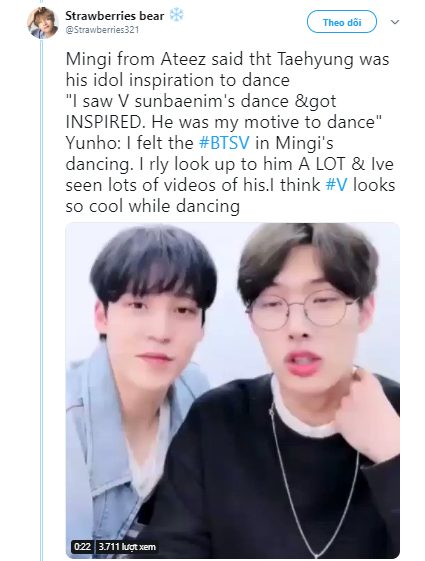 Trong một chương trình phát sóng khác, Min Gi, main dancer của ATEEZ, đã khiến mọi người trầm trồ khi cho biết chính V đã truyền cảm hứng cho Min Gi nhảy. Yunho, thành viên cùng nhóm của anh chàng đã xác nhận điều này, nói rằng V đã thực sự ảnh hưởng đến điệu nhảy Min Gi.