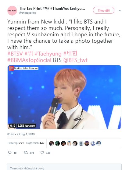 Trong suốt showcase của Newkidd, Yun Min nói rằng anh ấy rất kính trọng BTS, đặc biệt là V. Anh chàng thậm chí còn nói một cách đáng yêu rằng hy vọng trong tương lai, anh ấy sẽ có cơ hội chụp ảnh với V!