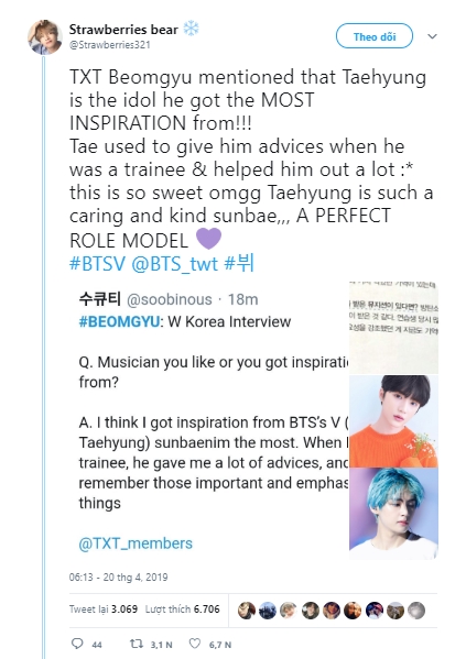 Beom Gyu có cùng công ty với BTS và V, đã thể hiện về tình yêu của anh chàng dành cho tiền bối của mình, đặc biệt trên tài khoản Instagram chính thức của V. Beom Gyu bày tỏ rằng anh rất vinh dự khi được xem trực tiếp ca khúc “Singularity” và điều này nhắc nhở anh làm việc chăm chỉ hơn nữa. Trong một cuộc phỏng vấn với W Korea, anh gọi V là nguồn cảm hứng lớn nhất của mình, nói rằng V đã cho anh nhiều lời khuyên quan trọng khi còn là thực tập sinh.