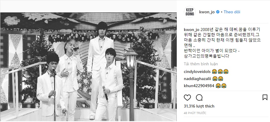 Cựu thành viên 2AM Jokwon: “Cùng debut năm 2008, cậu ấy hẳn là đã chuẩn bị mọi thứ thật chỉn chu nhất, mình hy vọng cậu vẫn giữ lấy trái tim quý giá đó và sẽ không còn phải đau đớn nữa. Cậu bé ngày nào giờ đã hóa thành ngôi sao - An nghỉ nhé”.