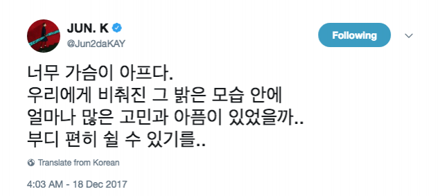 Thành viên 2PM Jun.K: ”Trái tim tôi đau quá. Có rất nhiều tâm tư và nỗi đau đằng sau ánh hào quang. Hy vọng cậu ấy ra đi thanh thản”.