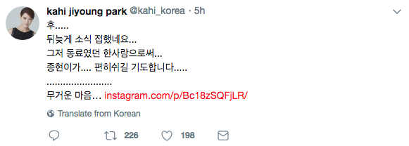 Cựu thành viên After School Kahi: ”Tôi vừa mới nghe tin. Với tư cách là đồng nghiệp của cậu ấy, tôi hy vọng Jonghyun sẽ ra đi thanh thản. Thật nặng nề quá”.