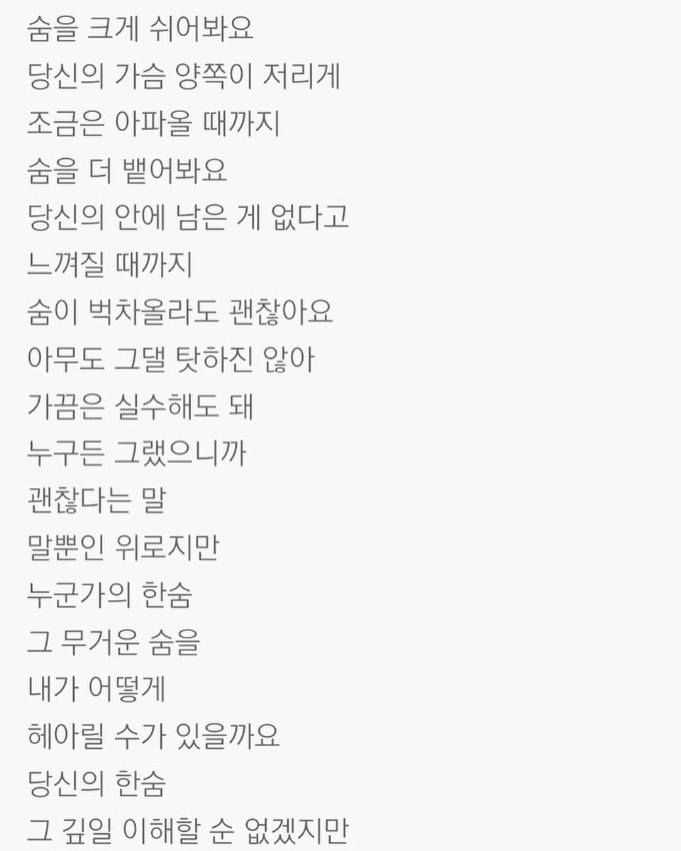 Lee Hi chia sẻ lời bài hát Breathe mà Jonghyun sáng tác cùng tâm sự: ”Lần đầu tiên nghe ca khúc lúc thu âm, em đã hoàn toàn quên đi những khó khăn mình từng trải qua và nhận được sự động viên từ mọi người, em biết ơn anh nhiều lắm, quả là một ngày đau thương. Có lẽ lời bài hát chính là những lời an ủi mà chúng ta muốn nghe từ người khác. Hy vọng anh ra đi bình yên”.