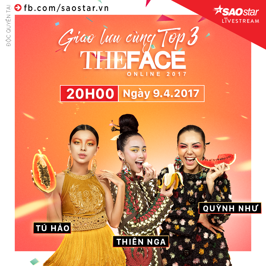 Để có thể giao lưu, gặp gỡ gần gũi hơn với khán giả, vào lúc 20h00 hôm nay (Chủ nhật - 09/04), Top 3 Tú Hảo, Quỳnh Như, Thiên Nga sẽ trực tiếp livestream giao lưu cùng các độc giả, khán giả hâm mộ chương trình trong suốt thời gian qua trên fanpage chính thức của Saostar, hứa hẹn sẽ tiết lộ khá nhiều bí mật thú vị về họ cũng như hành trình sắp đến tại The Face đấy.