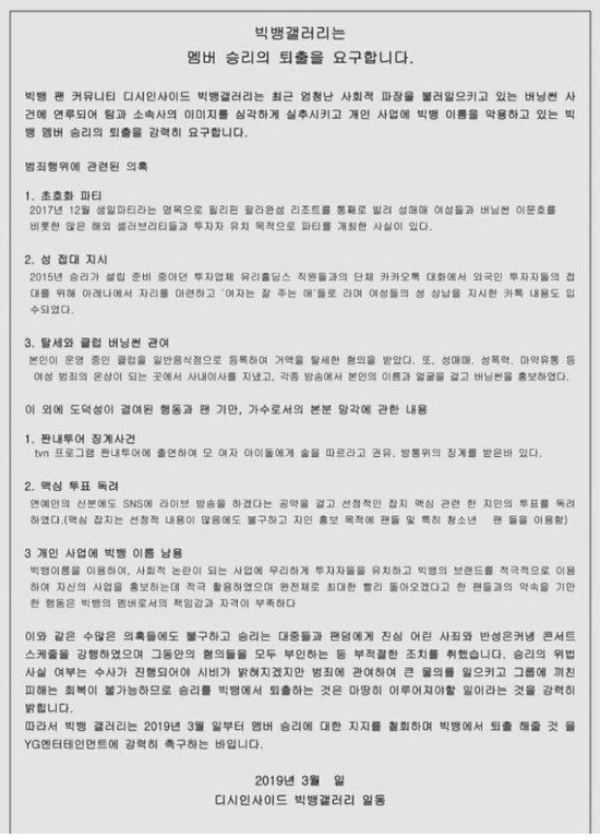 Vào ngày 9 tháng 3 vừa qua, cộng đồng người hâm mộ trong “DC Gallery” đã trực tiếp đưa ra một danh sách để tranh luận về các lý do tại sao không muốn Seungri tiếp tục ở lại Big Bang? Trong bản kiến nghị, họ đã đề cập đến những cáo buộc liên quan đến vụ việc của câu lạc bộ “Burning Sun”!