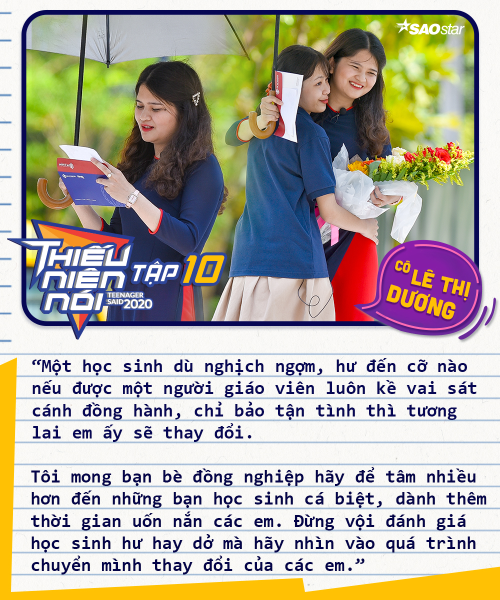 Tập 10 Thiếu niên nói 2020 khép lại bằng những trải lòng chân thành đến từ thầy và trò trường trường Song ngữ Quốc tế Học viện Anh Quốc - UKA Bà Rịa. Trên bục dũng khí, Nam Thư - Gil Lê và Phương Mỹ Chi hạnh phúc chứng kiến khoảnh khắc các em học sinh bày tỏ tình cảm cho người thân trong gia đình và niềm tri ân đối với thầy cô giáo.