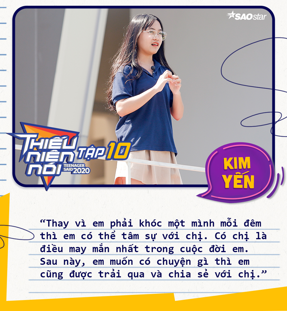 Sự hiểu chuyện và cảm thông của Kim Yến cho tật xấu ngủ mớ của chị gái khiến Gil Lê - Phương Mỹ Chi hết lời khen ngợi. Biết chị gái bị bệnh trầm cảm và một mình chống chọi suốt 6 năm, cô học sinh lớp 9 càng thương chị, mong muốn chia sẻ với chị nhiều hơn. Đối với Kim Yến, chị gái chính là một “món quà” may mắn trong cuộc đời cô bé: Có chị mà em có người tâm sự, bầu bạn thâu đêm suốt sáng, là người có thể lắng nghe và chia sẻ mọi điều trong cuộc sống.
