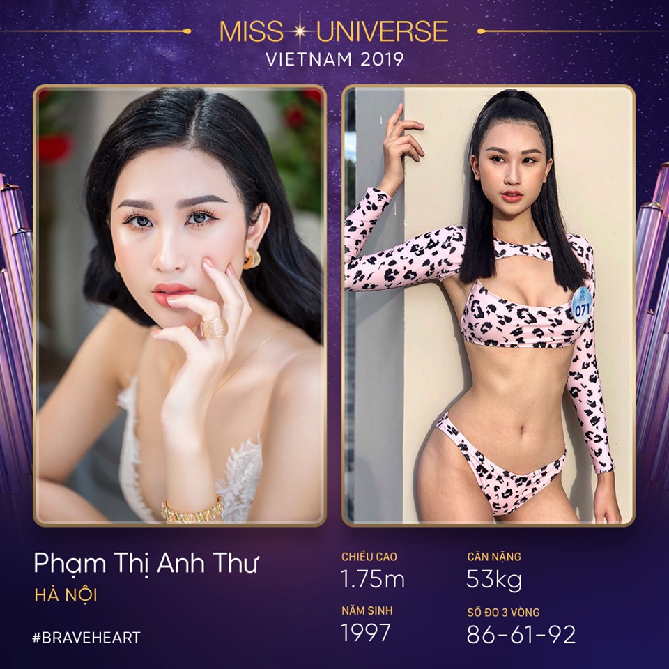 Phạm Thị Anh Thư gây được hiệu ứng lớn khi tiếp tục chinh chiến Miss Universe Vietnam 2019. Cô nàng sở hữu chiều cao lý tưởng, hình thể nóng bỏng và là một nhan sắc có thể biến hoá đa dạng. Anh Thư được rất nhiều fan sắc đẹp ủng hộ và bình chọn tại cuộc thi.