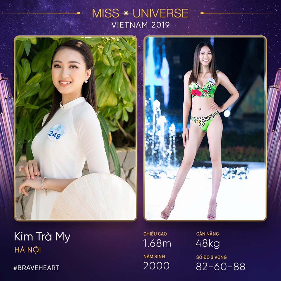 Kim Trà My sở hữu nhan sắc ngọt ngào và trẻ trung. Dù còn khá non nớt nhưng quyết tâm chinh phục chiếc vương miện của cô gái này rất quyết liệt và đó chính là lý do tại sao Trà My tiếp tục tìm kiếm cơ hội tại Miss Universe Vietnam 2019.