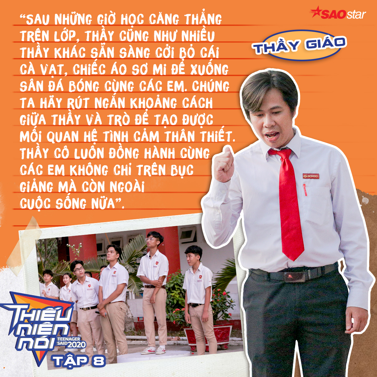 Tập 8 Thiếu niên nói 2020 gây bất ngờ cho người xem với màn hoán đổi vị trí trên bục dũng khí giữa thầy giáo và học sinh. Lần đầu tiên, người thầy lên tiếng bảo các em học sinh hãy rút ngắn khoảng cách thầy trò bằng những hoạt động vui chơi, thể thao cùng nhau. Đôi lúc tâm lý sợ thầy cô của các em học sinh khiến cho mối quan hệ trở nên xa cách và luôn có 1 bức tường chắn ngang và dĩ nhiên để xóa bỏ ranh giới đó, cả thầy và trò đều phải chủ động, mở lòng.