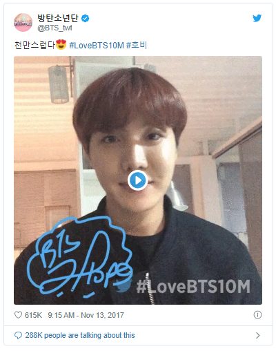 Khi BTS đạt 10 triệu người theo dõi, nhóm đã làm một post đặc biệt hơn với video được ghi hình đặc biệt, mỗi thành viên đều đăng tải gif của riêng mình với hashtag #LoveBTS10M.