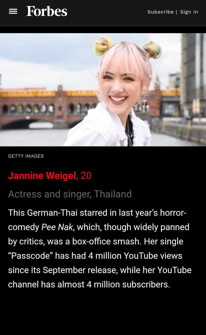 Nghệ sĩ Thái Lan trẻ tuổi nhất trong danh sách 100 ngôi sao khu vực châu Á - Thái Bình Dương có sức ảnh hưởng nhất trên mạng xã hội chính là cô gái mang trong mình 2 dòng máu Thái - Đức Jannine Weigel.Cô bé sở hữu chất giọng ngọt ngào, có thể hát được nhiều ngoại ngữ và khả năng diễn xuất cũng rất tuyệt vời. Chính nhờ sự đa tài này mà Jannine Weigel được rất nhiều khán giả yêu mến. Hiện cô đang sở hữu những tài khoản MXH với lượt theo dõi khủng từ Instagram, Youtube hay Facebook.